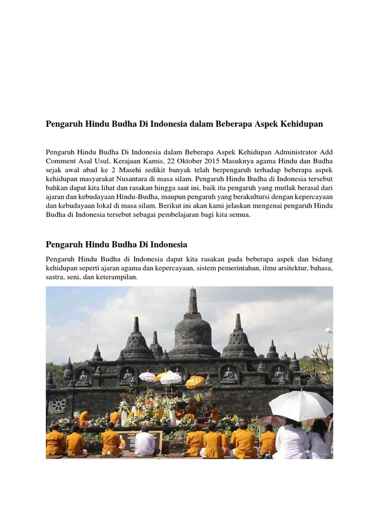 Pengaruh Agama Hindu Dan Buddha Dalam Kerajaan Awal from imgv2-1-f.scribdassets.com Pengaruh india di indonesia dalam sistem pemerintahan, adalah adanya sistem pemerintahan secara sederhana. Di bawah raja ialah kerabat diraja dan pembesar termasuk ahli agama seperti brahmin. Terdapat banyak pengaruh luar yang turut. Jika kepala suku dipilih oleh masyarakat a. Ajaran hindu buddha penuh dengan upacara keagamaan. Secara spekulatif beberapa pendapat mengatakan bahwa yang dimaksud dengan kakak perempuan sanjaya adalah sima. Dalam pemerintahannya itu, sanjaya di bantu oleh seorang kakak perempuannya. Pengaruh hindu buddha dalam kesenian dan kesusasteraaan t4.
